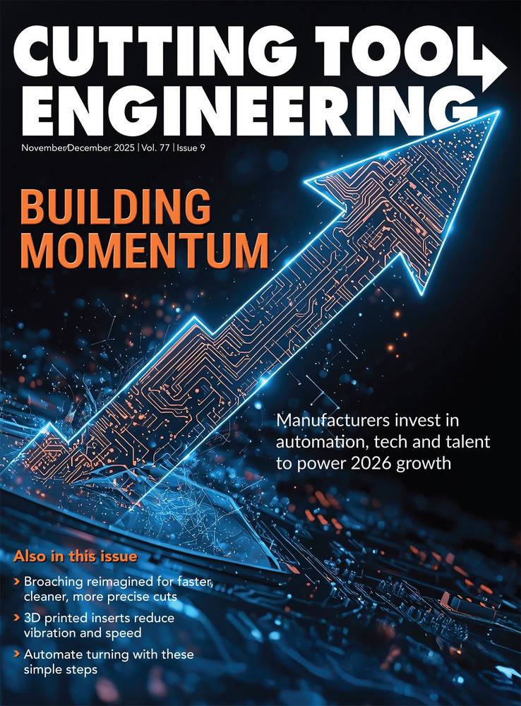 CUTTING TOOL ENGINEERING November⁄December 2025 | Vol. 77 | Issue 9 BUILDING MOMENTUM Manufacturers invest in automation, tech and talent to power 2026 growth Also in this issue Broaching reimagined for faster, cleaner, more precise cuts 3D printed inserts reduce vibration and improve speed Automate turning with these simple steps